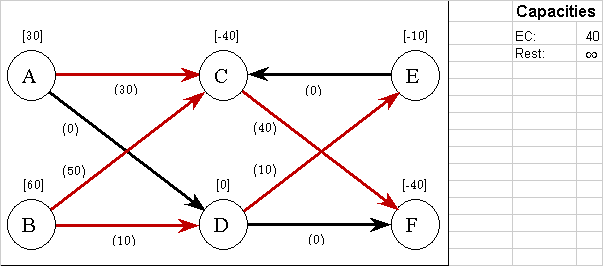 | We have completed another iteration of the network simplex method. The new basic feasible solution is shown above. To begin the next iteration, we again need to select an entering basic arc (or determine that the current solution is optimal). There are three nonbasic arcs (AD, DF, and EC) which could potentially be the entering basic arc. We will consider each of these arcs in turn. |