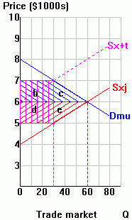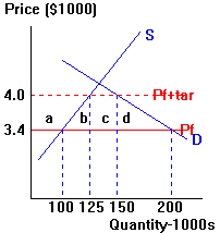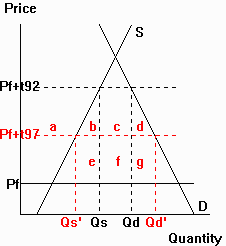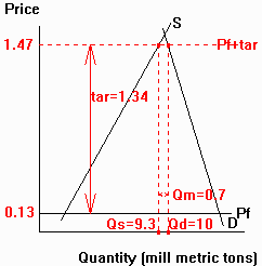 in the article. See diagram to right (1) Pw=$0.13; (2) tariff=$1.34; (3) Pj=$1.47; (4) Qd=10 mill. tons (5) Qs=9.3; (6) Qm=0.7 |