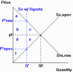 (2) OPEC, and (3) the world as a whole, which result from OPEC's export quota. (1) ROW importers lose bc (2) OPEC exporters gain b, lose e (3) World loses ce |