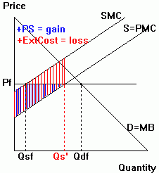Suppose the diagram to the right shows the market for refined gasoline. The production of refined gasoline causes local air pollution which accounts for the gap between PMC and SMC illustrated in the diagram. |
